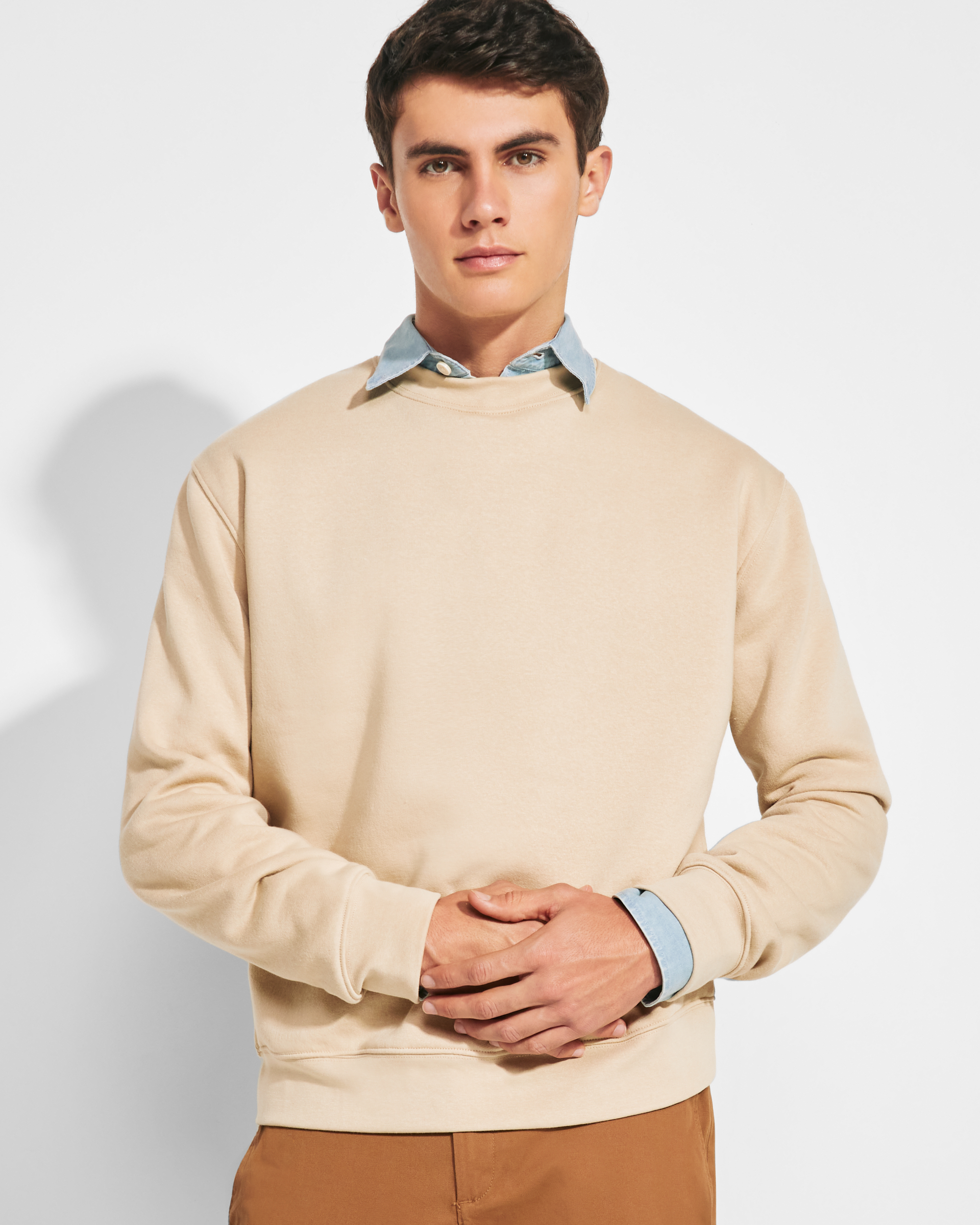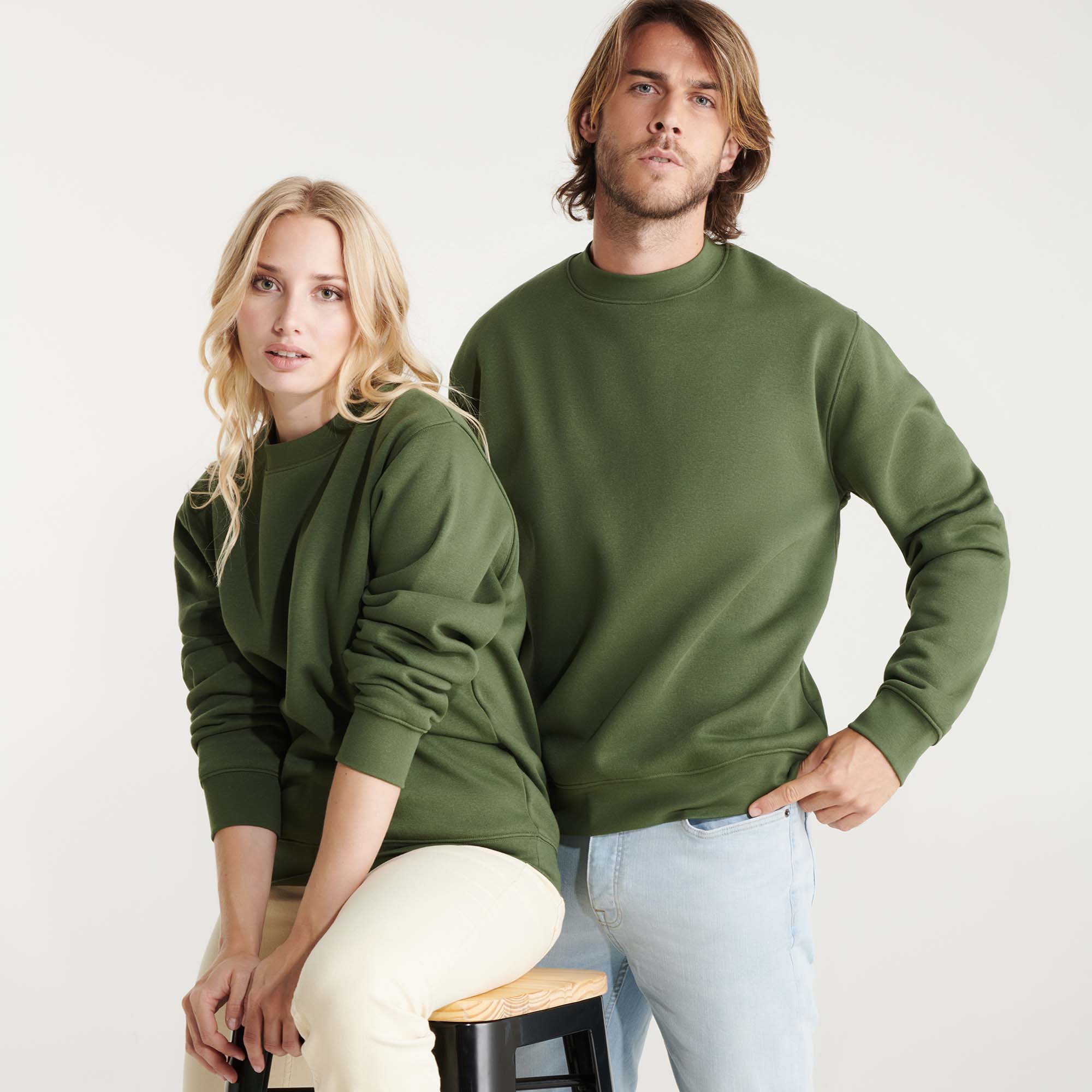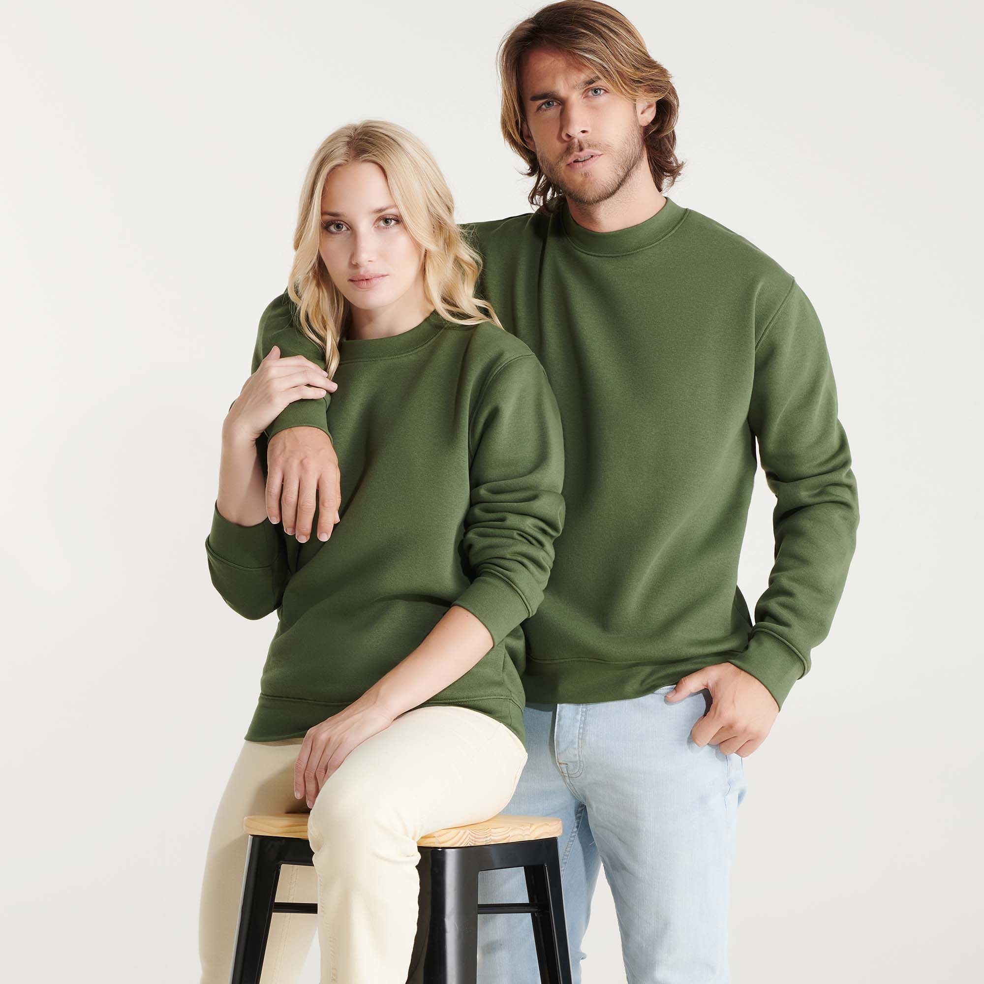 Sudadera en diseño clásico, con cuello, puños y cinturilla de punto canalé 1×1 con elastano. Cubrecosturas reforzado en cuello.