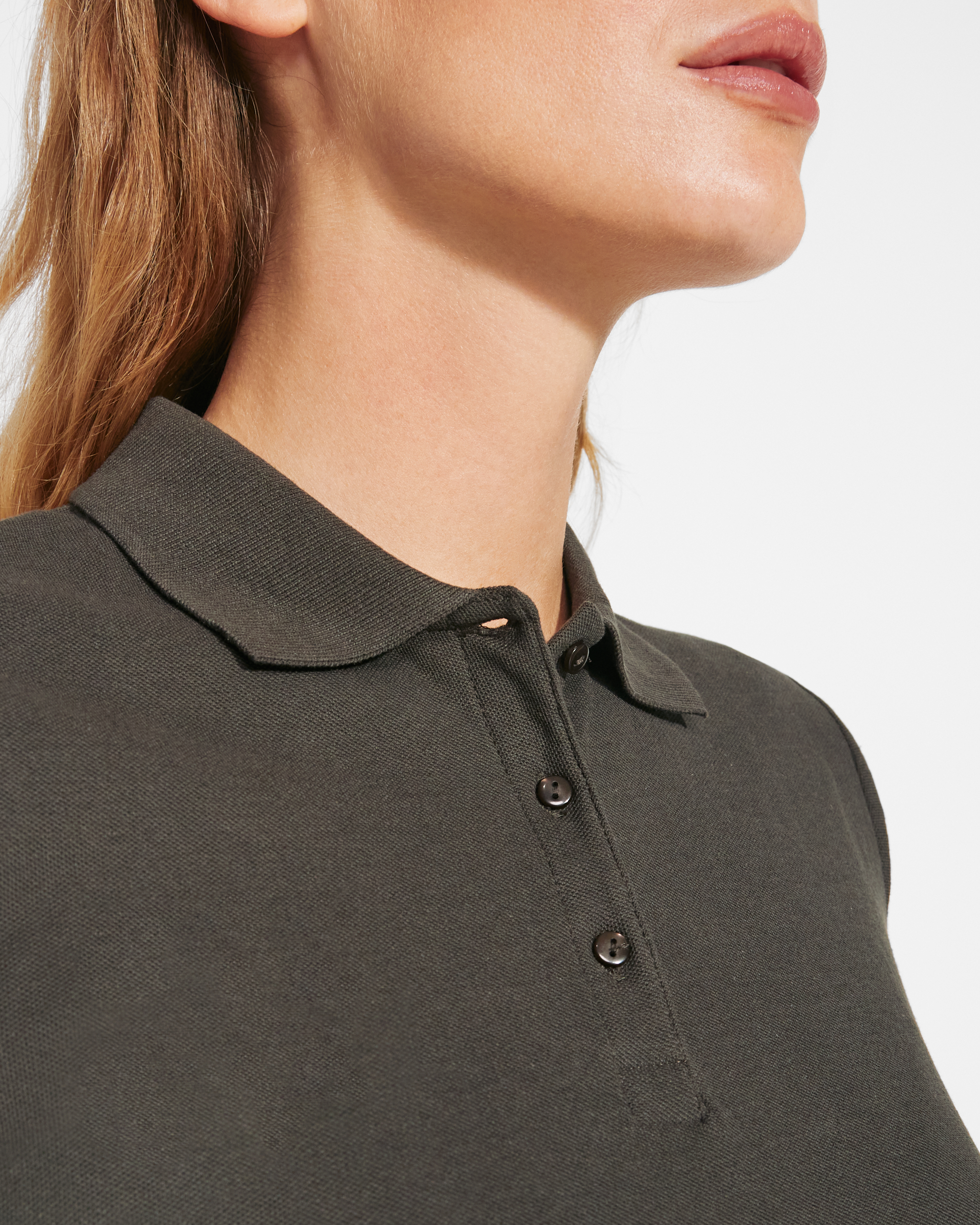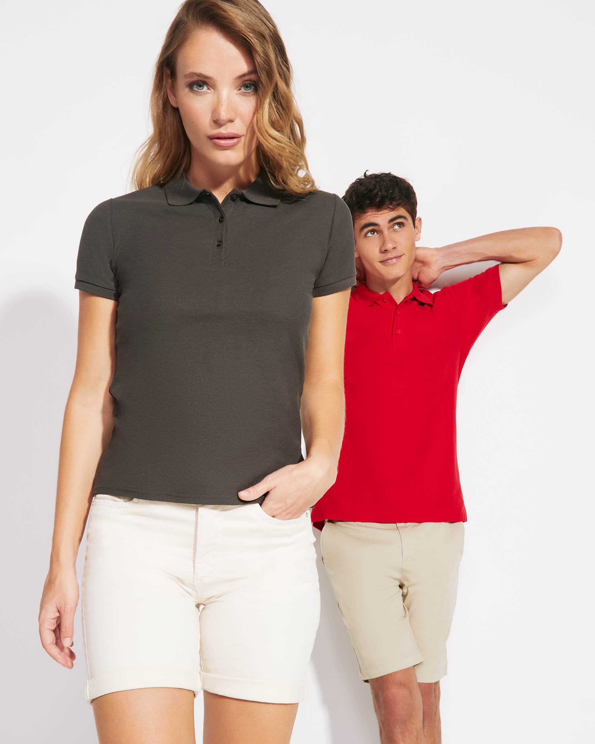 Polo de manga corta entallado. Cuello y ribete de manga en canalé 1×1. Tapeta con 3 botones. Cubrecosturas reforzado en cuello. Aperturas laterales en el bajo.