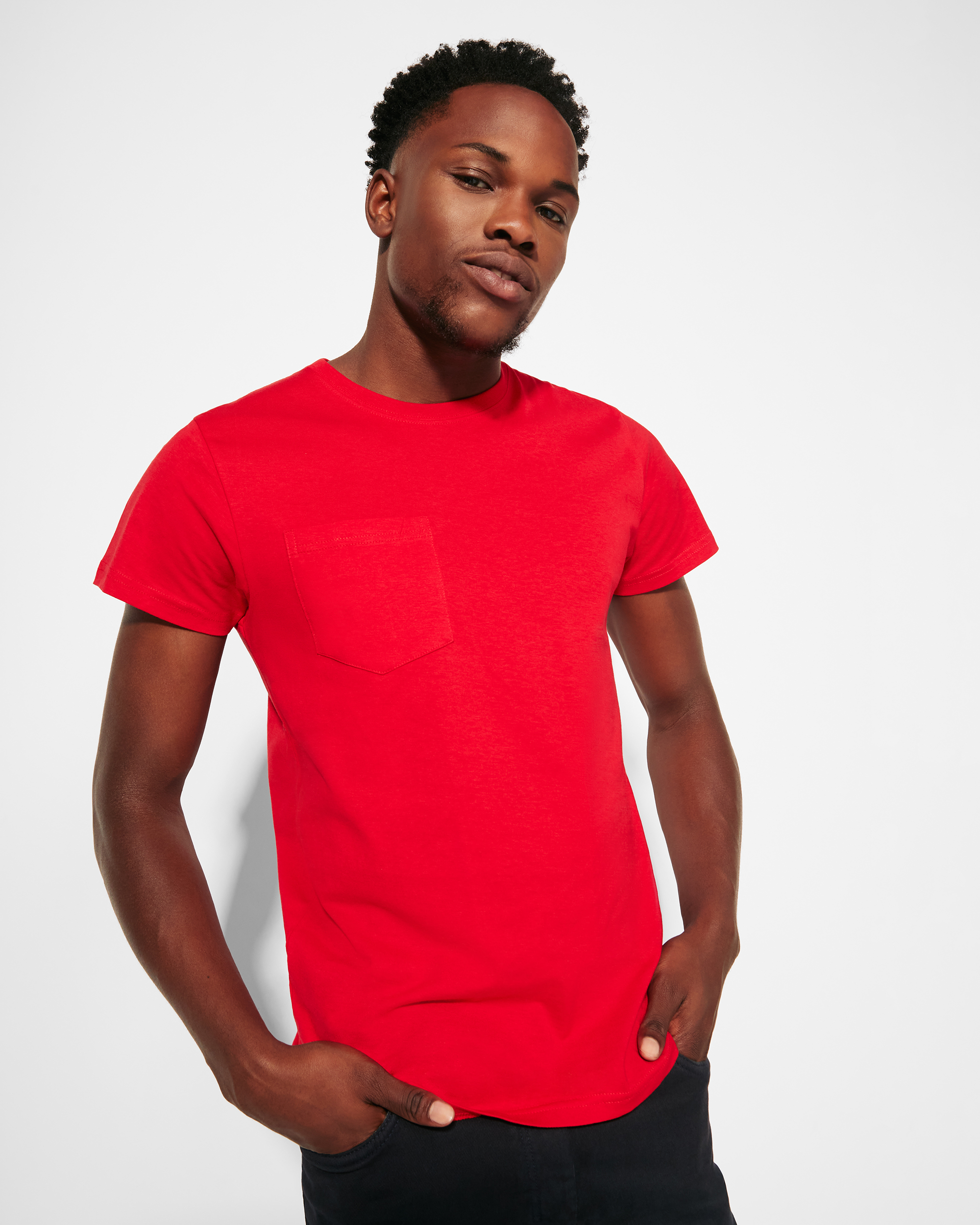Camiseta de manga corta y cuello redondo de 4 capas. Cubrecosturas reforzado en cuello y hombros, costuras laterales y bolsillo frontal.