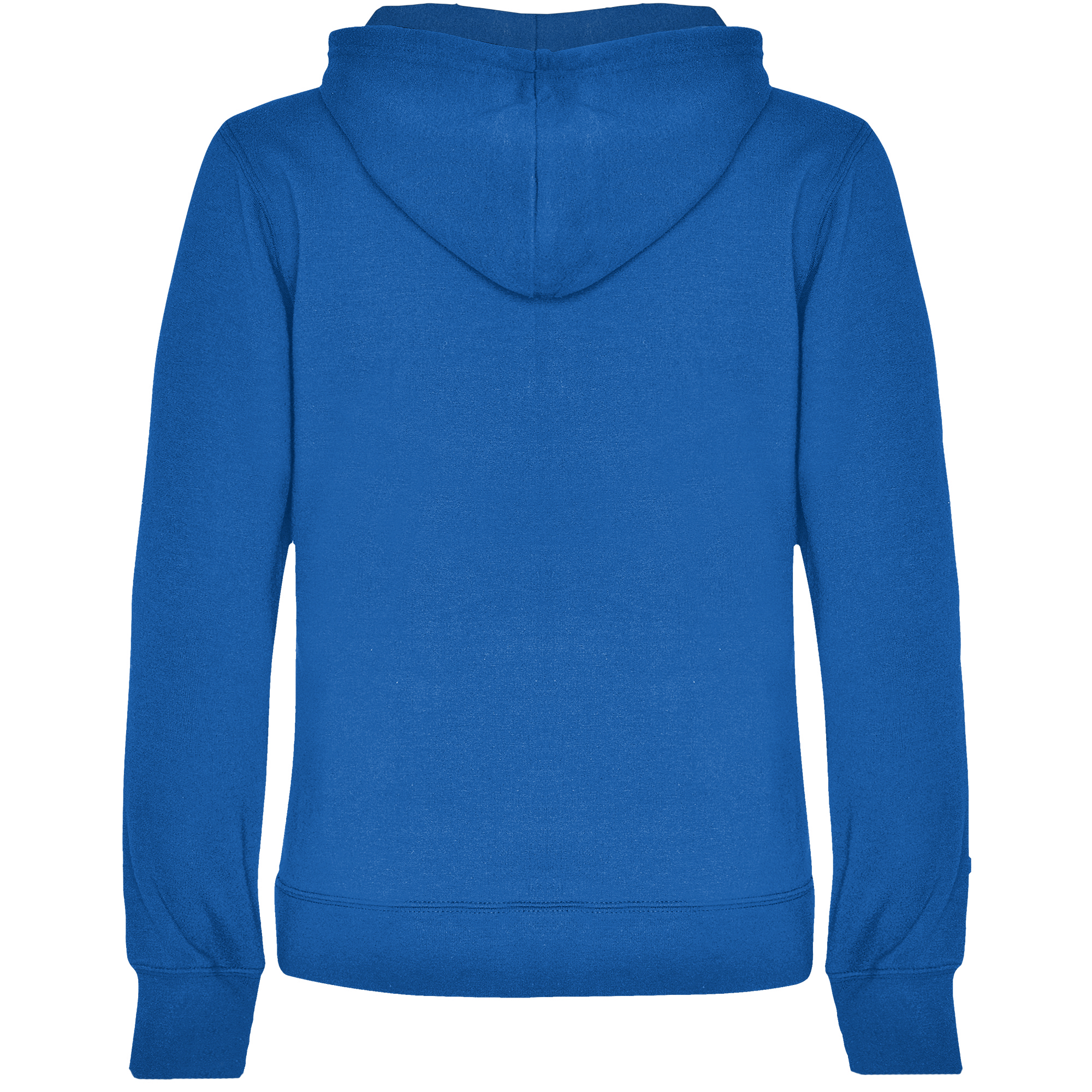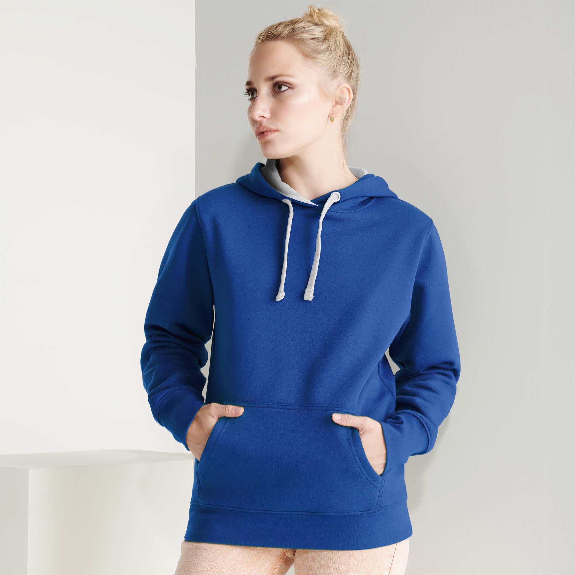 Sudadera entallada de corte femenino con capucha bicolor de doble tejido, con cordón contrastado ajustable, cubrecosturas en el cuello y bolsillo canguro. Punto canalé con elastano 1×1 en puños y cintura. Detalle thumb slit – puños con apertura para el pulgar.